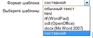 5. Выберите формат шаблона: "обычный текст", "html", "rtf", "odt", "docx", "excel" (далее описывается создание шаблонов формата текст/html, про прочие типы читайте в соответствующих раздела документации)